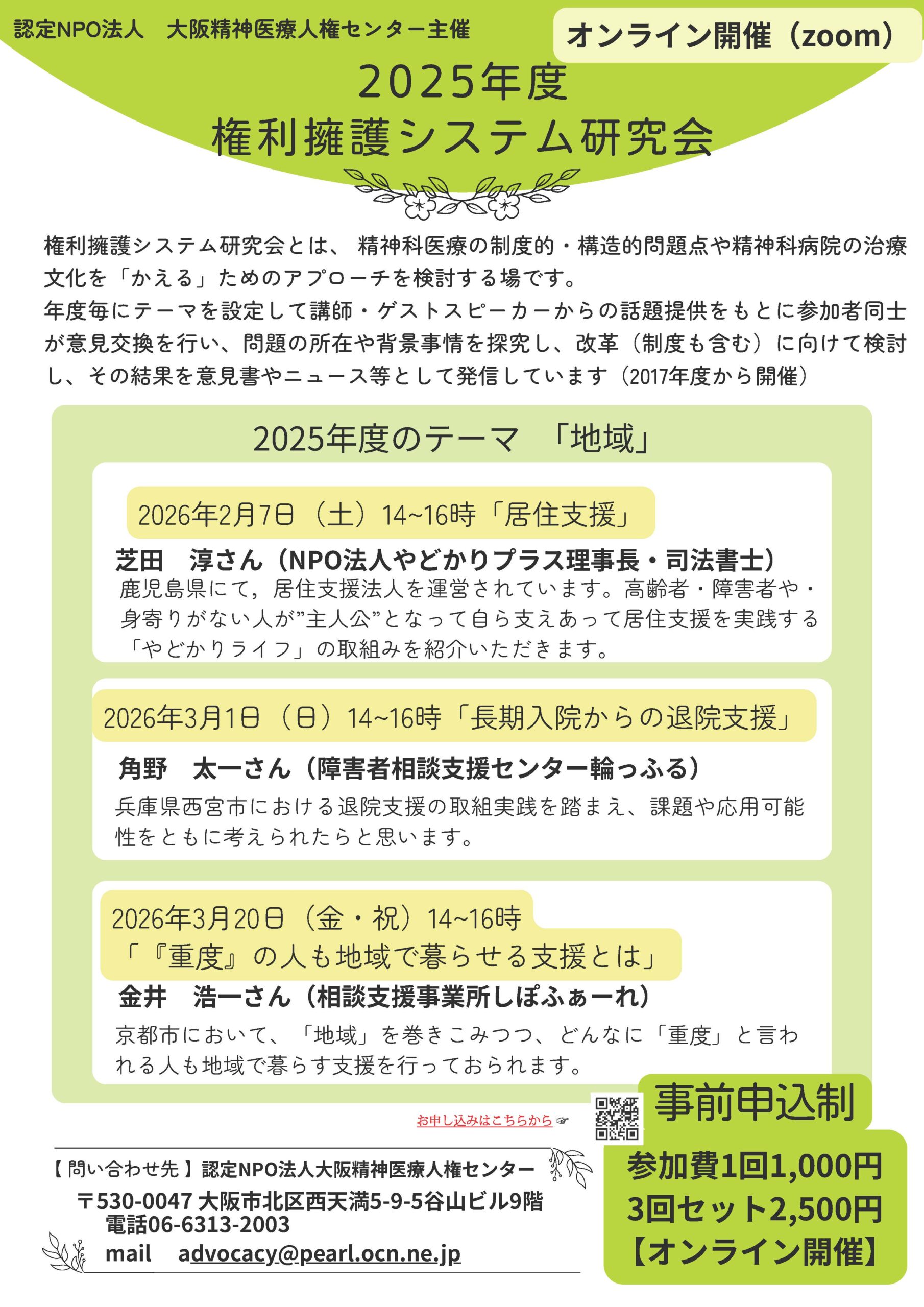 | テーマ | 大阪精神医療人権センターでは、「社会をかえる」というビジョンのもと、政策提言活動や精神疾患、精神障害に対する差別、偏見をなくすための啓蒙活動を行い、安心してかかれる精神医療の実現を目指しています。 権利擁護システム研究会では、精神医療施策の課題について、各論点に造詣の深い有識者からの話題提供を受け、それぞれの立場を超えてともに考え、議論する場を設けています。 2024年度のテーマは、「病床削減を考える」。病床削減をどう実現していくのか、各会で様々に議論されました。 2025年度のテーマは「地域」です。 【第1回】「居住支援」 【第2回】「長期入院からの退院支援」 【第3回】「『重度』の人も地域で暮らせる支援とは」 |