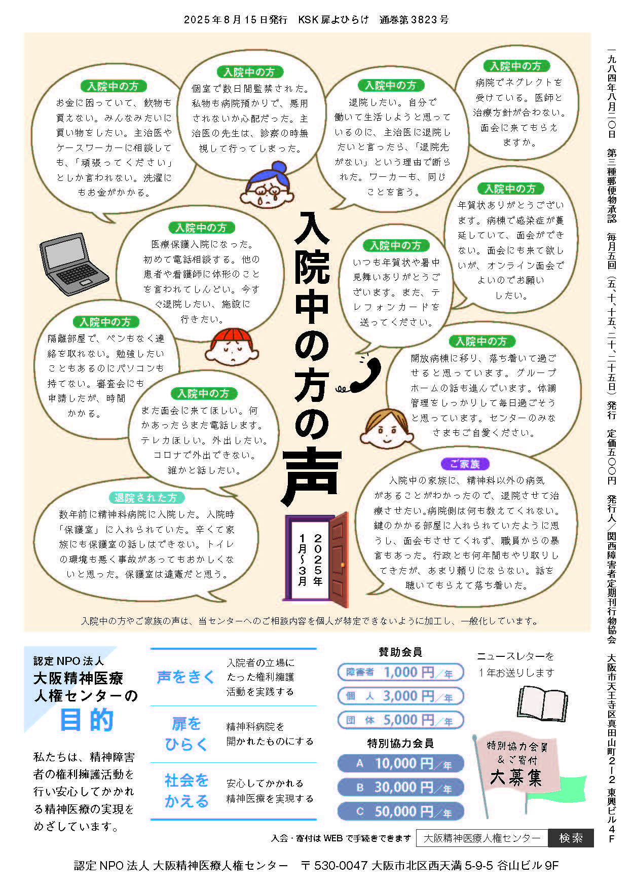 | 人権センターニュース 2025年度夏号 | **主な内容** 1.第26回定時総会記念講演「当事者の語りから、長期入院を考える」 2.理事NOTE 3.療養環境サポーター報告書(結のぞみ病院) 4.ふらっと通信/2025年度寄付のお願い 5.入院中の方の声(2025年1~3月) |