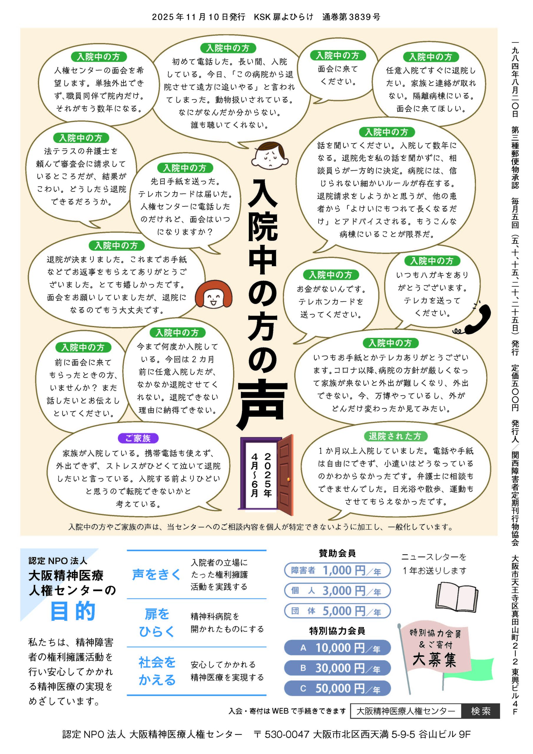 | 人権センターニュース 2025年度秋号 | **主な内容** 1.大阪精神医療人権センター40周年誌発刊! 2.精神科病院での身体拘束についての裁判 3.2024年度権利擁護システム研究会報告(第3・4回) 4.理事NOTE 5.療養環境サポーター報告書(和泉中央病院・丹比荘病院) 6.できごと 7.ふらっと通信 8.入院中の方の声(2025年4~6月) |