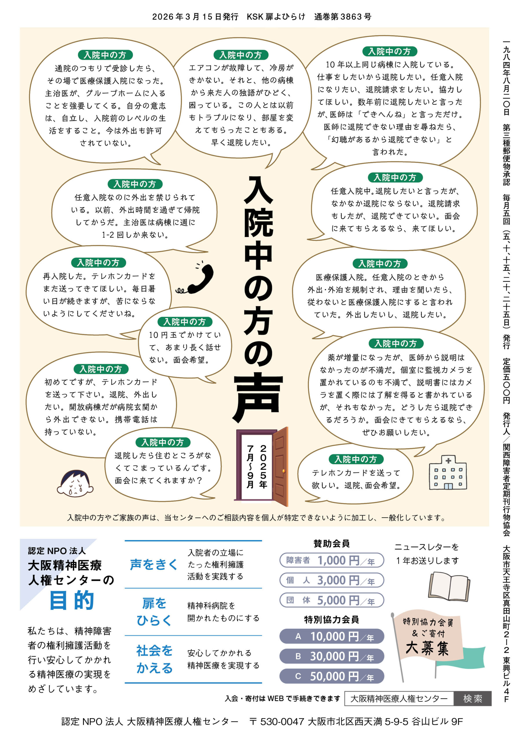 | 人権センターニュース 2025年度冬号 | **主な内容** 1.新刊書籍のご案内 2.定時総会のお知らせ 3.ともに扉をひらいて―40周年記念集会報告 4.精神障害者の人権をとりもどす支援をともに 弁護士八尋光秀 5.理事NOTE 6.療養環境サポーター報告書(関西医科大学総合医療センター・大阪精神医療センター) 7.千葉精神医療人権センター設立1周年イベントのご報告 8.ふらっと通信 9.入院中の方の声(2025年7~9月) |